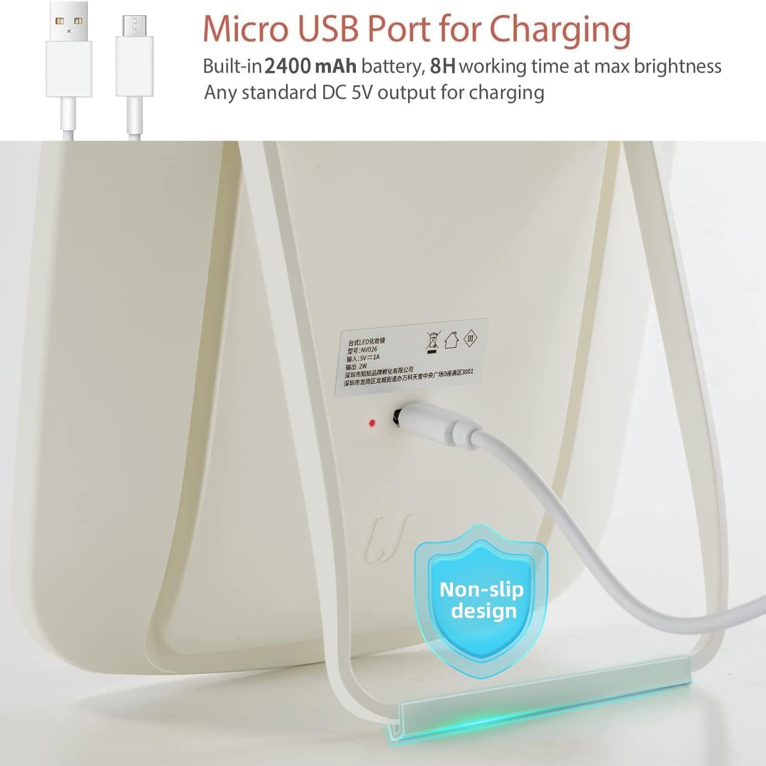 - USB Rechargeable Makeup Mirror – The desk mirror with light comes with a USB charging cable, the built-in 1500mAh battery can work for 250 minutes after fully charged.